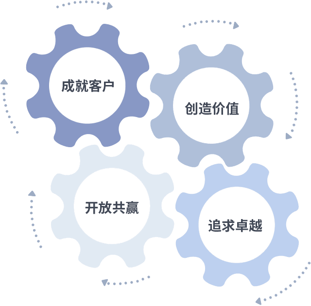 成就客户是一切决策的出发点,,,,创造价值是衡量所有工作的标准,,,,追求卓越是我们做事做人的态度,,,开放共赢是我们的格局也是最终的结果。。。。价值观的齿轮环环相扣,,,,推动着组织里的每个人不断向前。。。。